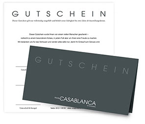 Falls Sie mal nicht wissen was Sie einer modebegeisterten Frau schenken wollen, haben wir den CASABLANCA-Gutschein für Sie, dessen Betrag Sie frei wählen können.